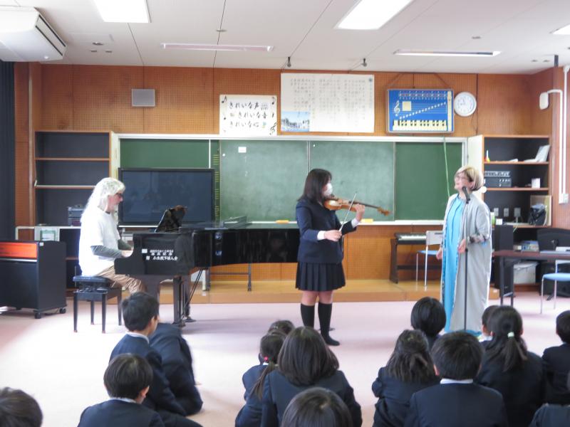 アーティストによる、教育プロジェクト「ふるさとからプロの道へ」というイベントが行われました。ヴァイオリンとピアノ演奏を聞いたり、ヴァイオリンを弾いてみたりしました。その後、どのようにプロの道へつながっていったのかをお話され、好きなことと苦手なことを把握することや好きなことを続けることの大切さを教えていただきました。
