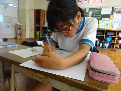 総合的な学習の時間で海を守るためにできることを考え,呼びかけポスターを作ることに決まりました。現在作成中の子どもたちです。