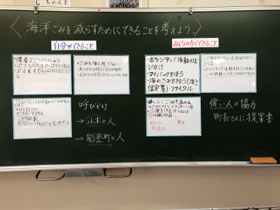 海中ごみがなぜ落ちているのか,なくすためにどうすればよいか,について考え話し合いました。発想豊かな子どもたちに考えに驚き,これまでの学習の成果が表れた時間となりました。