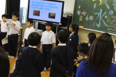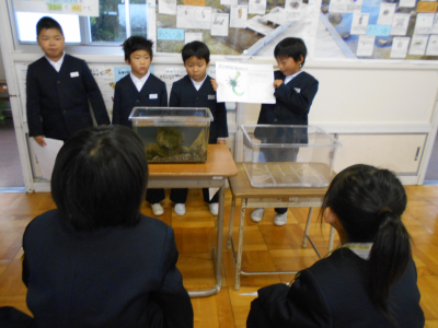 生き物たちのすみかとえさと体の大きさを「生き物紹介カード」にまとめて発表しました。紹介されたお友達は,生き物に興味を持ちとても楽しんでいました。