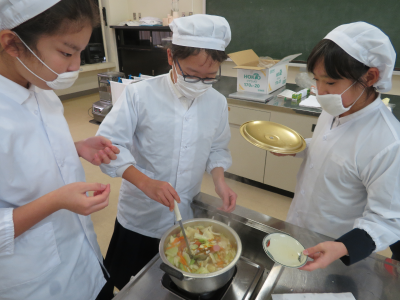 6年生は里海科の学習で,家庭科と絡めて「里海給食」の献立作りに取り組んでいます。今日は,自分たちで考えた献立を実際に作ってみることに!