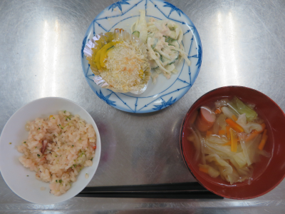 小木の特産品であるイカを使い,野菜多めの献立となりました。