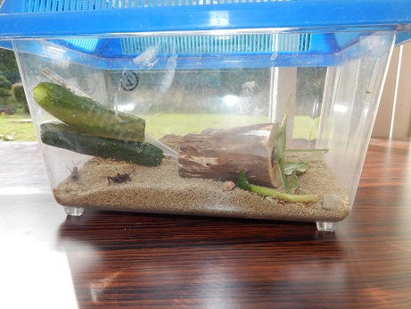 どうやら、バッタやコオロギ、カマキリなどの虫たちが中にいるようです。