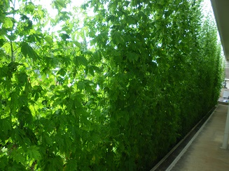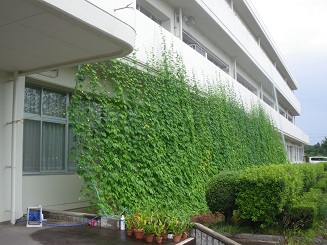 小木小学校の職員室前のグリーンカーテンです。校務員さんが一生懸命にお世話をしてくださって,今年も立派なグリーンカーテンができました。このグリーンカーテンのおかげで,職員室の気温も2度は違うかもしれません!?