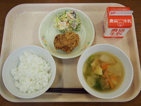 ごはん 牛乳 とりのからあげ ハーフポテトサラダ 具だくさんみそ汁