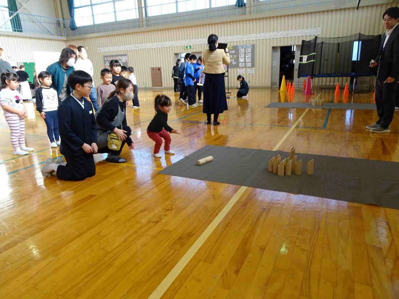 1年生が生活科で2年生を秋のおもちゃランドに招待しました。秋のもの(どんぐりやまつぼっくりなど)を使ってたくさんのおもちゃやゲームを用意しました。2年生全員が「楽しい!」「すごいね!」と言いながら楽しむ様子を見て1年生は嬉しそうでした。