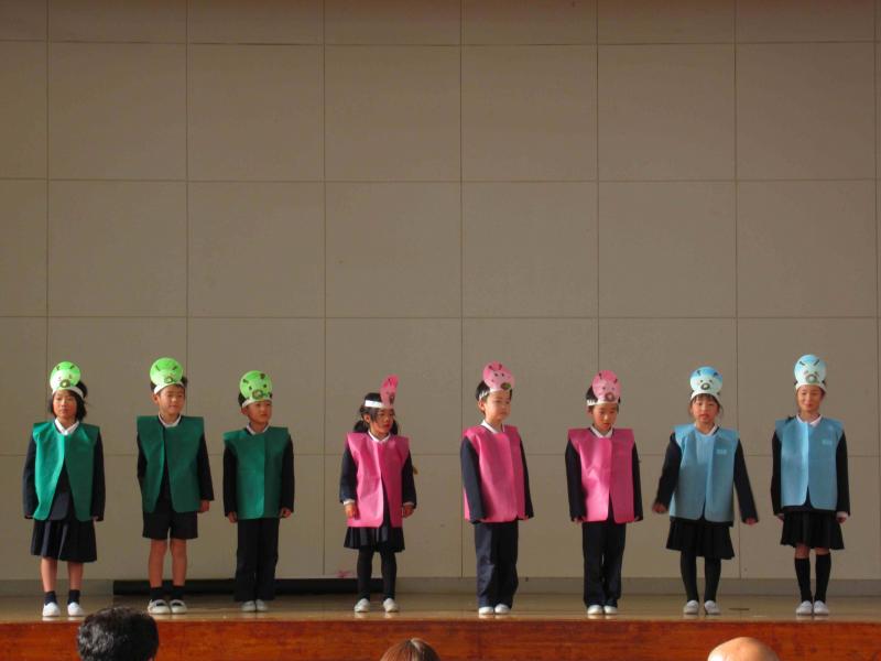 1年生が国語で学習した「おおきなかぶ」の音読劇を全校のみんなに披露しました。1年生は、はじめて全校のみんなの前で発表しました。緊張していましたが、最後まで音読劇をすることができました。