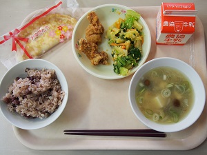 赤飯 鶏のから揚げ 菜の花あえ なめこ汁
