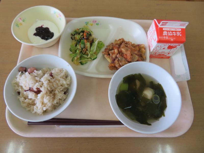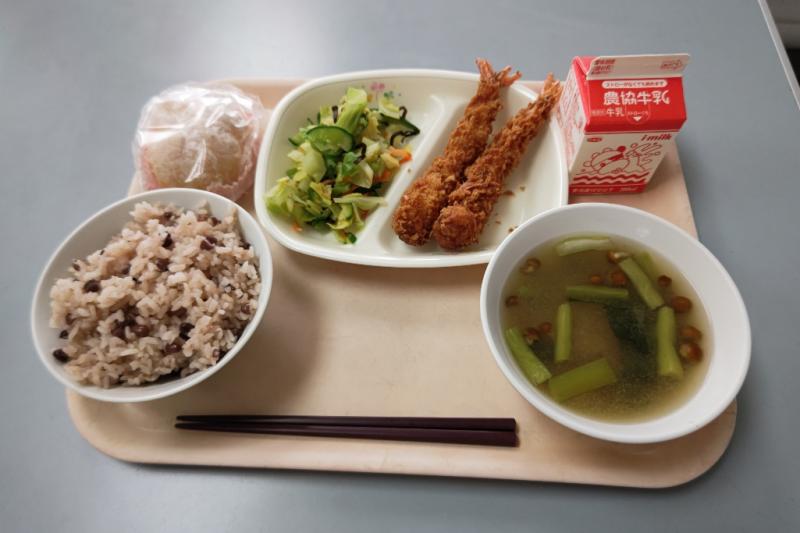 明日卒業する6年生にとっては、今日が小学校最後の給食。ということで「卒業お祝い給食」でした。エビフライ、大きかったです。