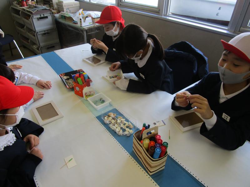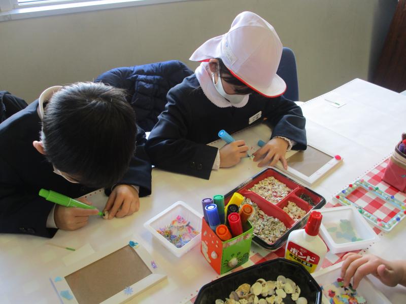 色紙の上に、海藻や型抜き紙を並べたり、マジックやスタンプで飾り付けをしたりと、それぞれが思い思いの作品を仕上げていました。活動後は、作品を見合って、感想を伝え合っていました。