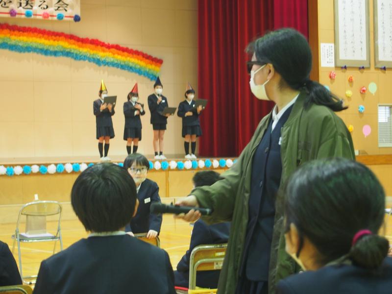 全ての学年に役割があり、全員がその仕事を頑張ってくれたおかげで素敵な会になりました。きっとみんなが今まで6年生にしてもらっていた様々なことに気づけたと思います。6年生、ありがとう!「正解しなければ私たちは卒業しない!」と、6年生からのクイズ!