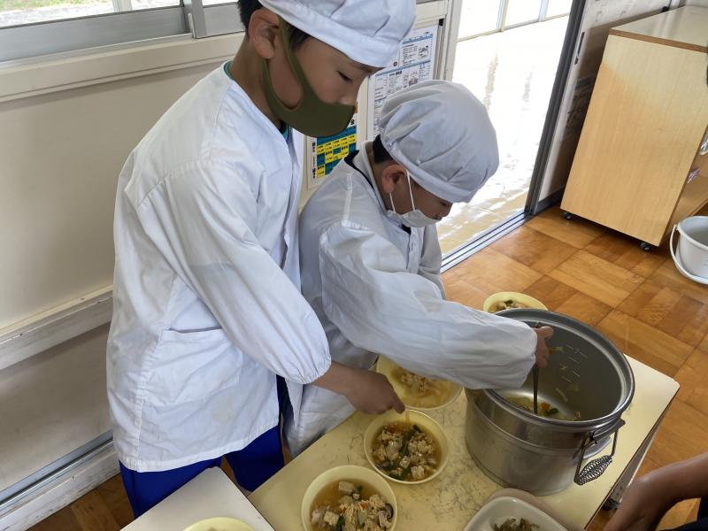 1年生になって初めて給食当番をしました。6年生の協力もあり、給食準備も片付けもてきぱきと進めることができました。1年生は、別の盛りつけもやってみたい!とやる気満々です。