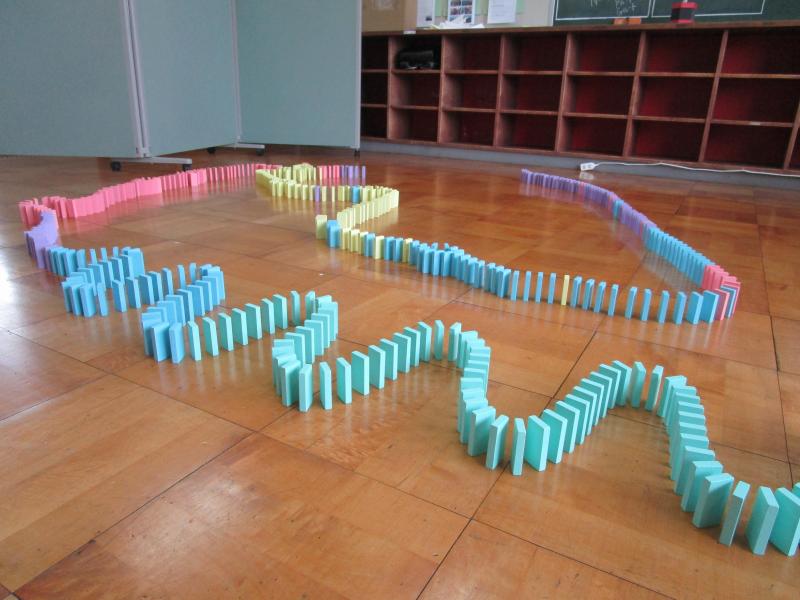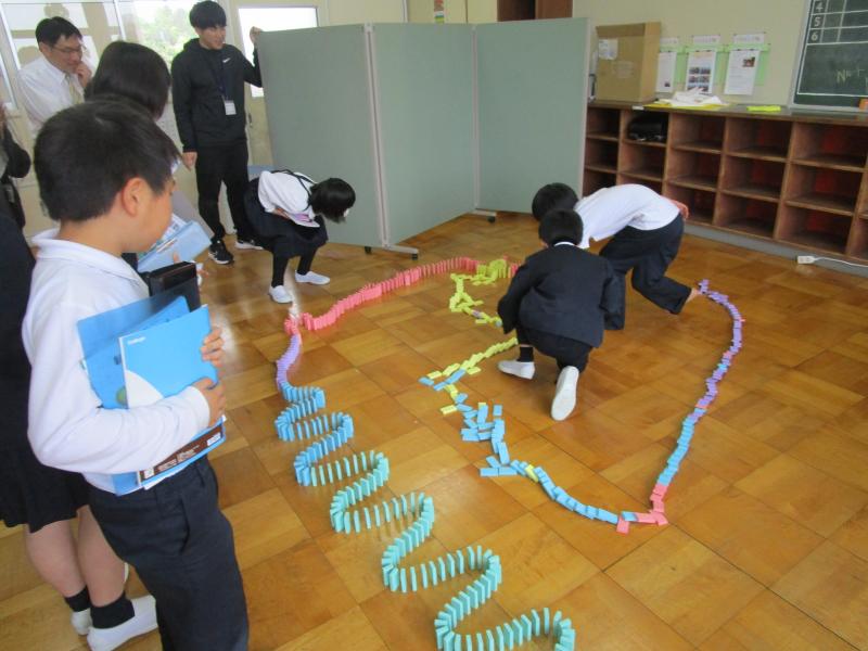 ひまわり学級でドミノ遊びをしました。がんばって並べ方を工夫して、なんとか完成させることができました。4年生みんなでドミノが倒れていくところを見ました。大盛り上がりでした。また、作りましょう!