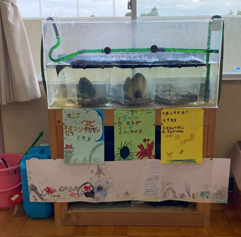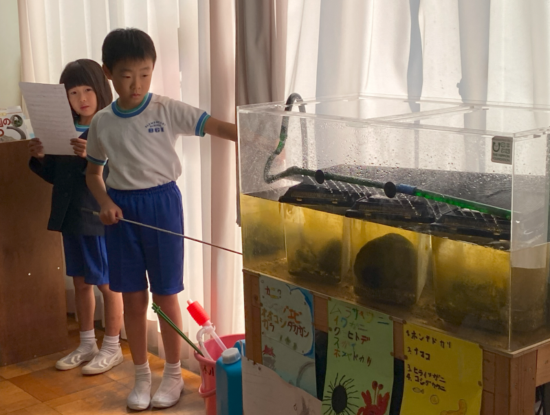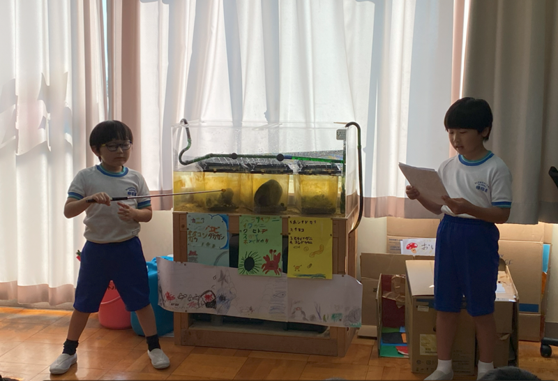 2年生で取り組んでいる九十九っ子水族館。海の生き物のお世話だけでなく、観察も行ってきました。今まで観察してきたことを、3年生や能登里海教育研究所の先生たちに向けて発表しました。