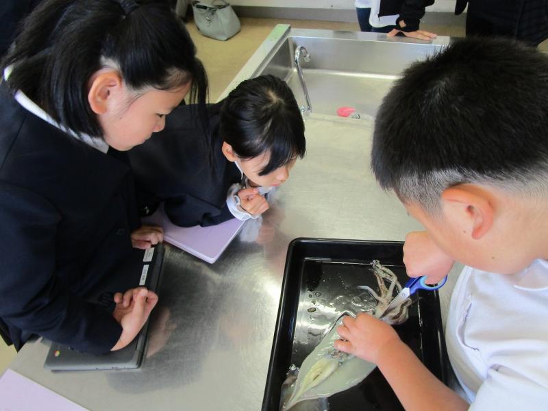 イカと人の体の同じところや違うところを対話しながら見つけていました。また、イカを触れないと言っていた児童が、触れるようになっていました。