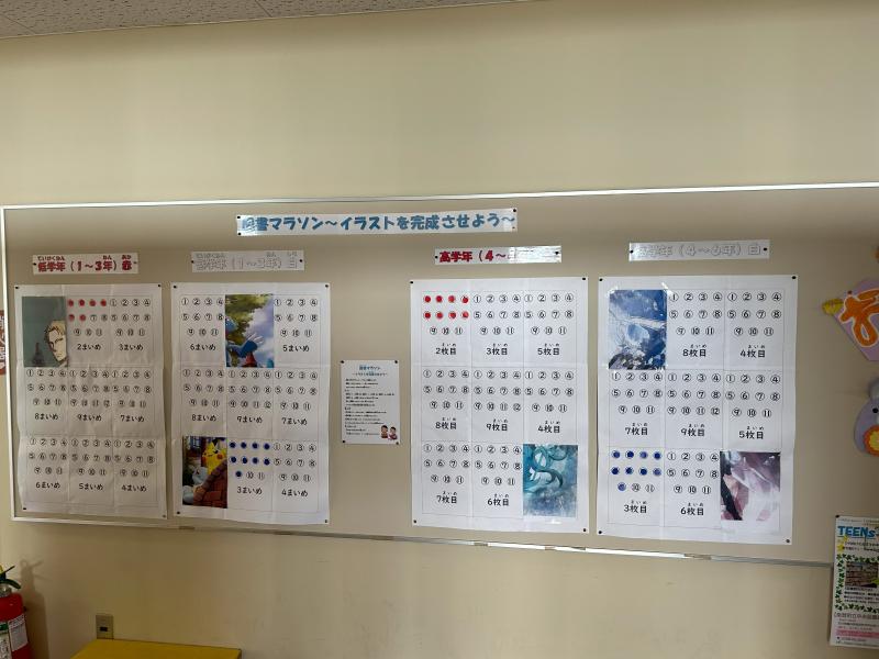 10月26日(木)から、図書館の利用を活発にする取組として、図書マラソンをしています。本を返すごとにシールがもらえ、シールが溜まるとイラストが出来上がります。これを機に、たくさん本を読みましょう!