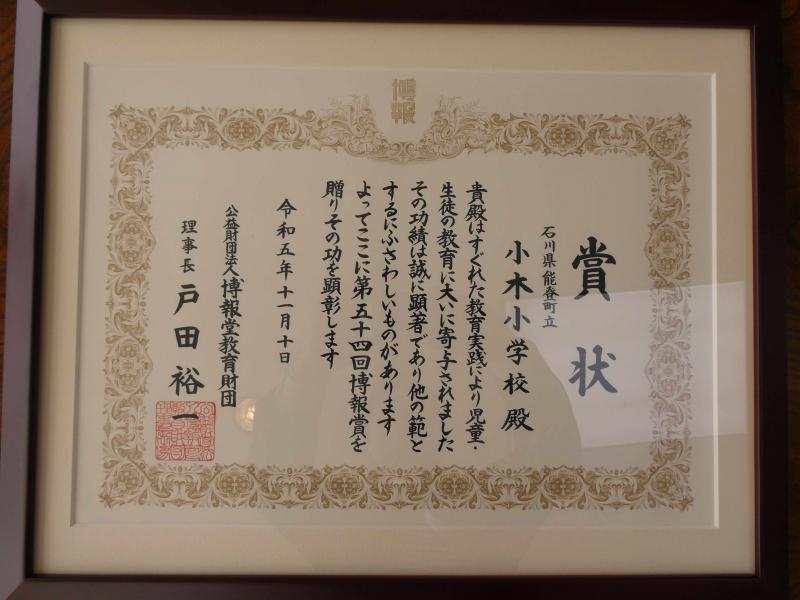 11月10日に加藤校長、夛村教諭、元小木小教頭で能登町教育委員会の小原次長が、東京で行われた贈呈式に出席しました。