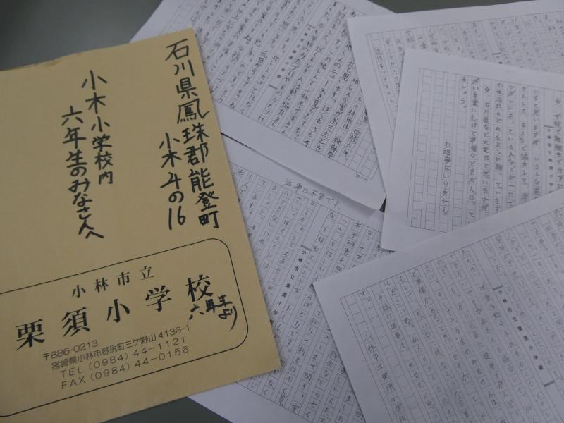 能登町の姉妹都市である宮崎県小林市の栗須小学校6年生の皆さんから、本校6年生へ励ましのお手紙をいただきました。