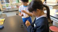 4年「物の体積と温度」の初めの学習で、試験管の口に石鹸水をつけて、手で試験管を温める実験をしました。「石鹸水の膜がどうなるかな?」と、みんな真剣に試験管を温め、膜を見つめていました。膜がふくらむと歓声をあげていました。これからの実験も楽しみです!