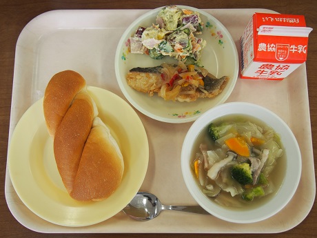 米粉パン 牛乳 秋鮭のマリネ おさつサラダ たっぷり野菜スープ