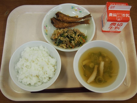 ごはん 牛乳 はたはたのカレー風味 豚肉と切干大根の炒め物 しめじのみそ汁
