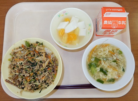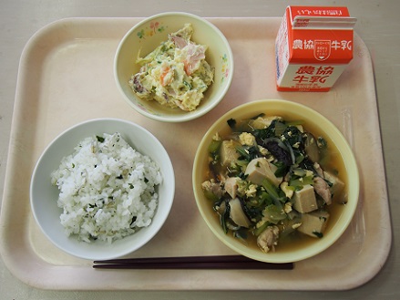 しらすわかめごはん 牛乳 とり肉とこうや豆腐のたまごとじ ハーフポテトサラダ
