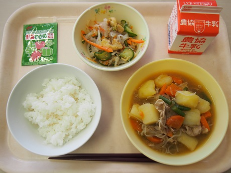 給食では代表的な具である、ぶたにく・じゃがいも・にんじん・玉ねぎのほかに