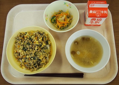 そぼろごはん 牛乳 金糸瓜の酢の物 なめこ汁