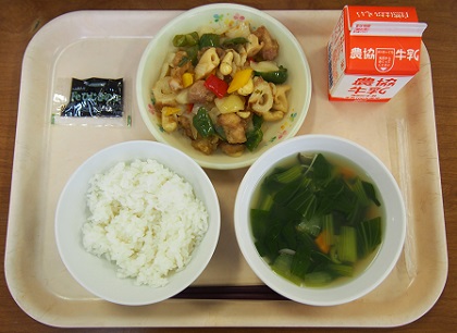 ごはん 牛乳 とり肉とカシューナッツの炒め物 チンゲン菜のスープ ひじきのり