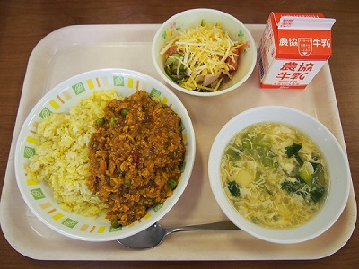 ドライカレー 牛乳 パリパリポテトサラダ たまごスープ