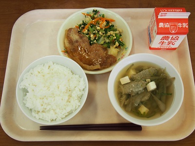 ごはん 牛乳 豚肉のてり煮 小松菜の彩り和え あじのつみれ汁