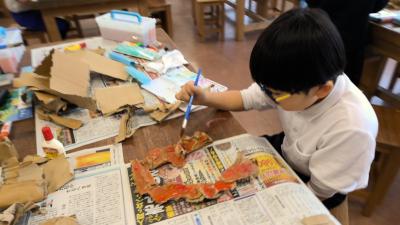 3年生は図工「だんボールの形をかえて」の学習に取り組みました。ちぎった段ボールを、ボンドの入った水につけて乾かすと、その形のまま固まります。その良さを生かして作りました。段ボールが乾くまでに、どうやって形を保つか考えました。子どもたちは洗濯ばさみや輪ゴムを使って工夫して固定していました。とてもおもしろい作品が完成しました。