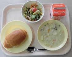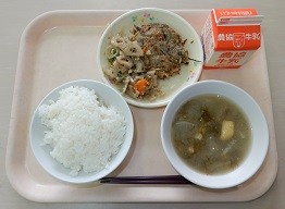 今日の給食ではサラダにぶた肉の冷しゃぶをまぜることで、野菜が苦手な子にも食べやすく仕上げました。