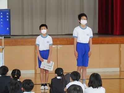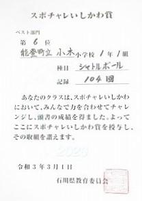 石川県が行っている事業です。インターネットで学年ごとに記録を登録して順位を競います。小木小学校では2年生が40mシャトルランで2位、1年生がシャトルボールで6位という成績を収め、賞状が届きました。