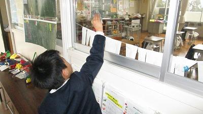 6年生も1年生も窓の汚れを見つけて磨きます。