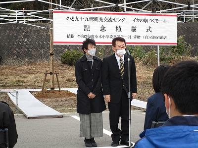 22日につくモールで記念植樹式が行われました。小木の石岡二郎様から卒業生の心に残ることをという御厚意により行うこととなりました。