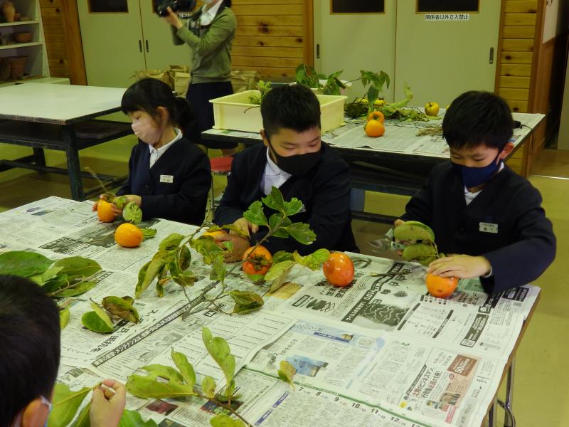 4年生が真脇縄文遺跡館で干し柿づくり体験を行いました。