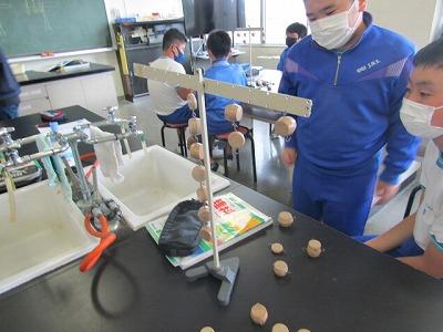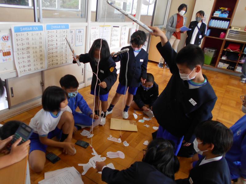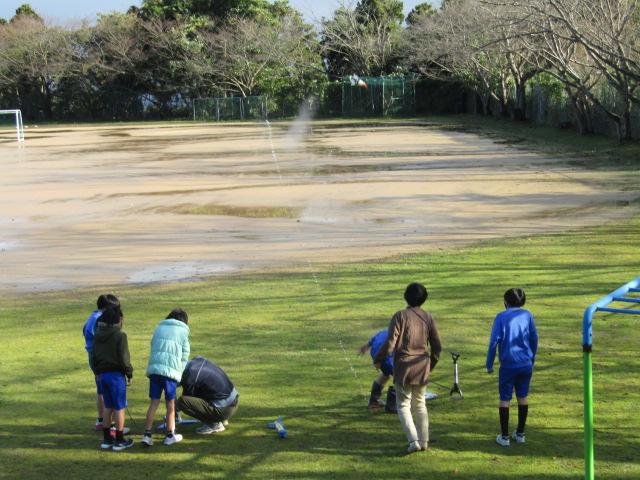 4年生が運動場でペットボトルロケットを飛ばしています。