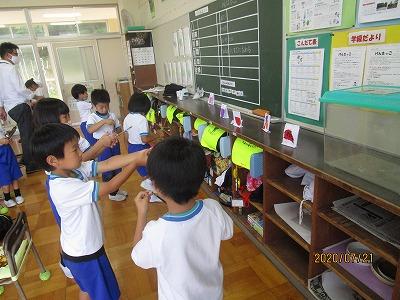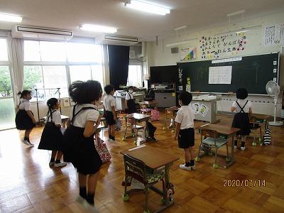 そこで持ち物のお話をしました。ハンカチ・ティッシュに加えてマスクを外した時に入れておくビニールや布の袋に名前を書いて持ってきます。お手数をおかけしますが、保護者の方のご協力をお願いします。