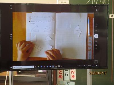 自分のノートをテレビの画面に映し説明しています。