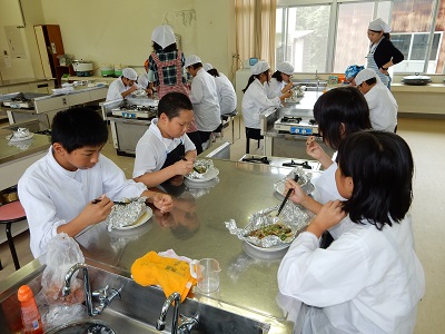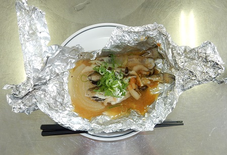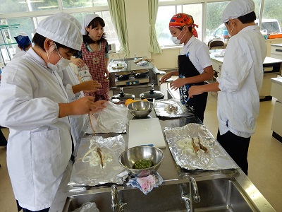 頂いたハタハタで今回はホイル焼きに挑戦です。包丁などで野菜を切りましたが、みなさんととても上手にできていました。