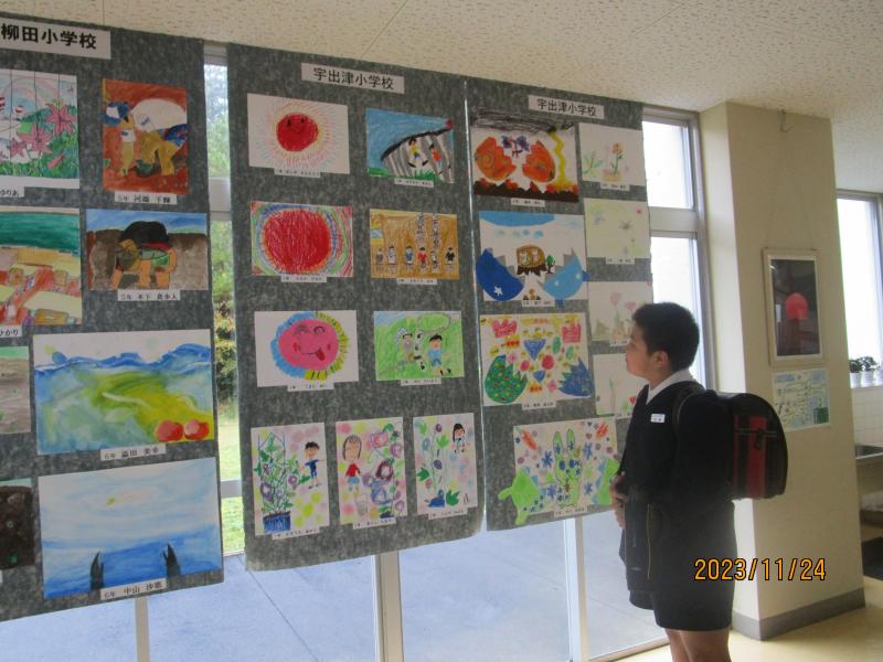 11月27日(月)~12月1日(金)の間、児童玄関から保健室前の廊下に、能登町内の各小中学校の絵画作品が掲示されています。ぜひ、足をお運びいただき、ご覧いただければ幸いです。