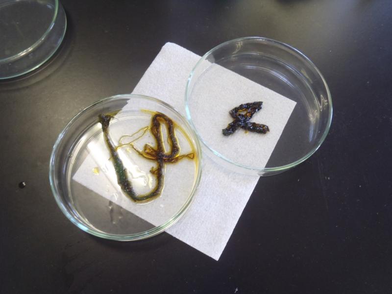 海藻には茶色(褐色)と緑色と紅色があるのですが、まずは緑色のスジアオノリで実験しました。片方は日光に当てないようにアルミ箔で覆っていたもので、もう片方は日光に当てたものです。