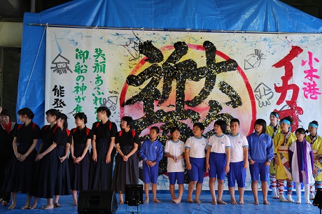 5年生は,イカの解剖を体験し,イカについてイカ博士から詳しく教えていただきました。その後,能登高校書道部のみなさんと協力し,大漁旗にイカを書きました。