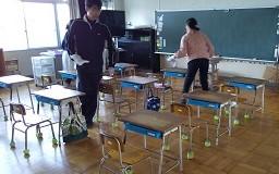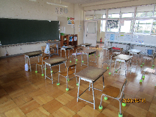 蛇口、ドア、電気のスイッチなどみんなが触るところはは毎日消毒しています。金曜日は先生たちが教室の児童一人一人の机を消毒しました。