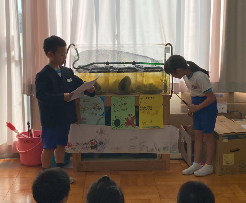 2年生で取り組んでいる九十九っ子水族館。海の生き物のお世話だけでなく、観察も行ってきました。今まで観察してきたことを、3年生や能登里海教育研究所の先生たちに向けて発表しました。