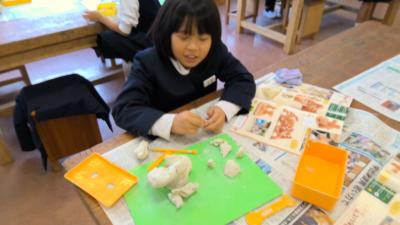 2年生は図工の時間、粘土を使って、楽しかったことや好きなものなど、形にしたいことを自由に表しました。「ラーメン屋に行ったことでもいい?」「寿司つくる!」「大谷選手にもらったグローブ!」など、思い思いに作っていました。久しぶりに触った粘土は、とても楽しかったようで、ずっと集中して取り組むことができました。