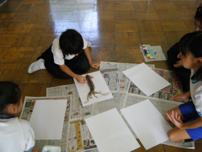 できたイカの絵はどれも迫力があり,イカの質感や色合いなどを上手に捉えることができていました。