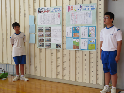 最後には小木中の生徒さんたちが各々が決めたテーマにそって学習したことを発表してくれました。エコノミー症候群を防ぐためのマッサージや風呂敷を用いたカバン作り,新聞紙で作ったコップやハンカチを使っての応急処置の仕方など,いざという時に役立つ情報をたくさん教えてくれました。