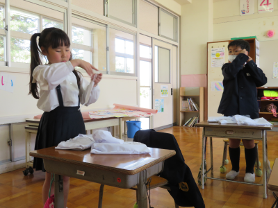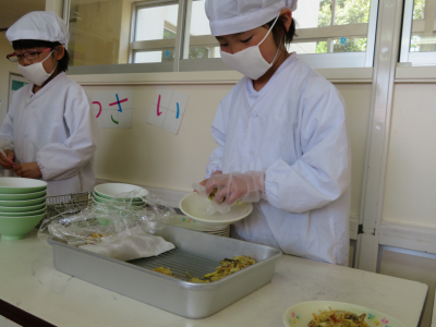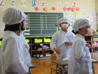 初めのうちは悪戦苦闘していましたが,練習を繰り返していくとだんだんとスムーズに着られるようになりました。そのまま,今日はイカグループの3人が給食準備に挑戦し,少し緊張しながらも上手におかずをよそったり,牛乳やはしを準備できました。